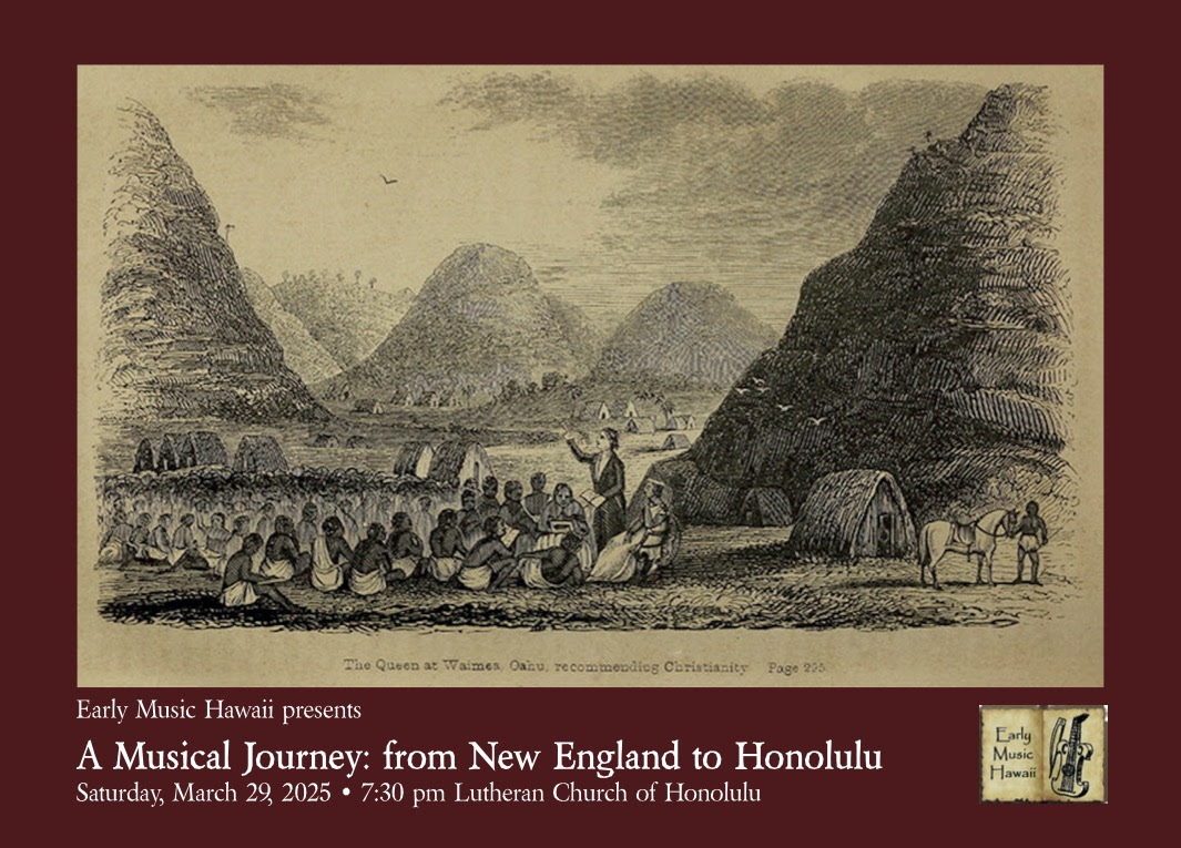The Early Music Hawaii Chamber Singers star in an exciting new venture, presenting the fascinating works of the early American singing schools alongside some of the earliest surviving compositions of Hawaiian hīmeni and mele.