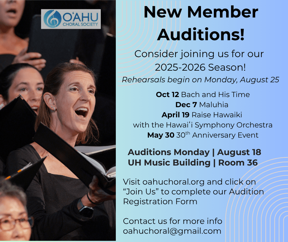 The Oʻahu Choral Society is holding auditions for new members August 18th 5:00-8:00 p.m. at the University of Hawaiʻi Music Building. We hope you will consider joining us for this exciting season! If interested, please click the button below to fill out an audition inquiry form!