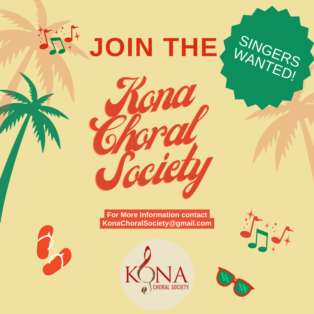 Artistic Director Susan McCreary Duprey and the Kona Choral Society invite sopranos, altos, tenors, and basses to join us for a special “Sit In and Sing” Open House rehearsal on Thursday, September 4, from 5:00 to 7:45 p.m. at Kona United Methodist Church, 74-4960 Palani Rd., Kailua-Kona, HI 96740. No audition is required—just come ready to sing and experience what the Kona Choral Society is all about! During this open rehearsal, we’ll preview our repertoire for the fall season. Regular rehearsals take place on Thursday evenings from 5:30 to 7:45 p.m., but for this first night, we’ll begin at 5:00 p.m. to allow time for music pick-up and registration. For questions, please complete the contact form below or email
