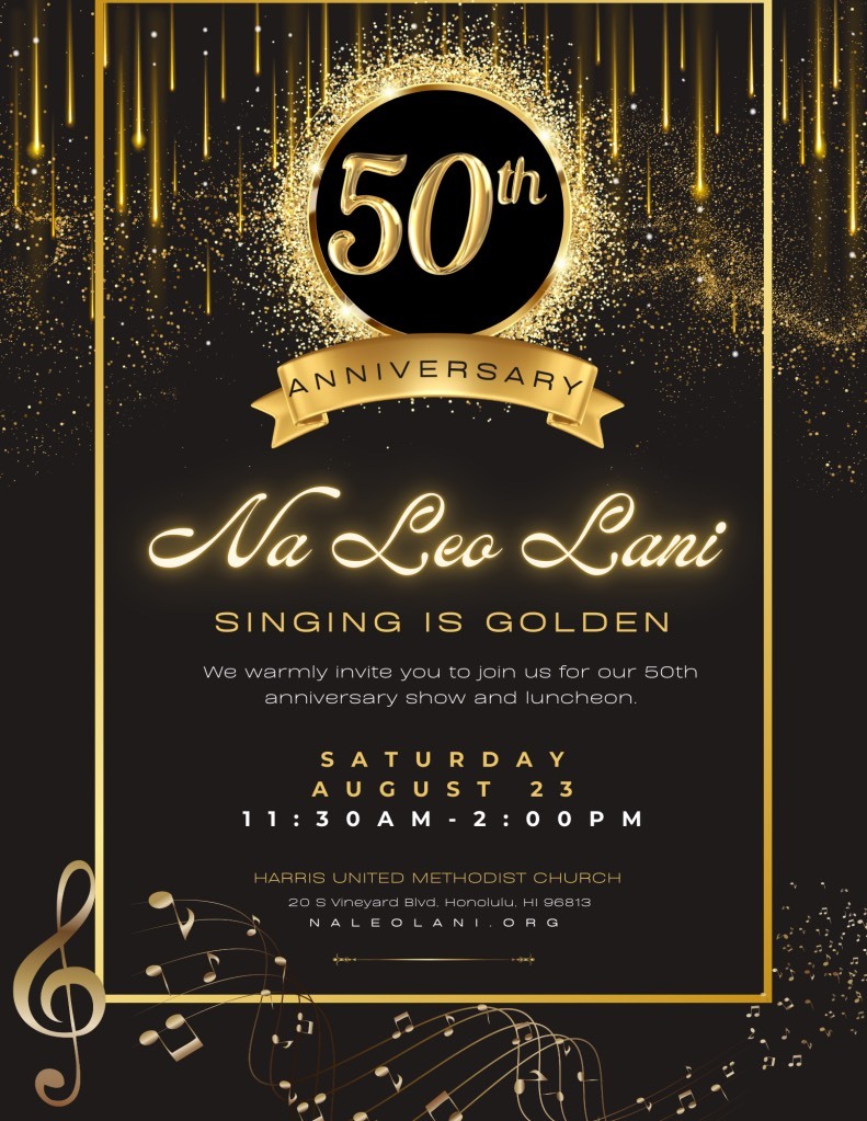 Join Na Leo Lani on Saturday, August 23, 2025, from 11:30 a.m. to 2 p.m. at Harris United Methodist Church in Honolulu as we celebrate 50 years of a cappella harmony on O‘ahu. This milestone concert will feature Na Leo Lani and friends in a Sweet Adelines barbershop performance, followed by a buffet luncheon of local favorites including Kalua Pig, Shoyu Chicken, Fish Tempura, Fried Noodles, Chinese Chicken Salad, and Rice. Reserve your seat for this special celebration by clicking “Purchase Tickets” below. Got a question? Fill out the contact form below, or email naleolanichirus@gmail.com. Visit http://www.naleolani.org for more information. We look forward to sharing music, laughter, and aloha with you!