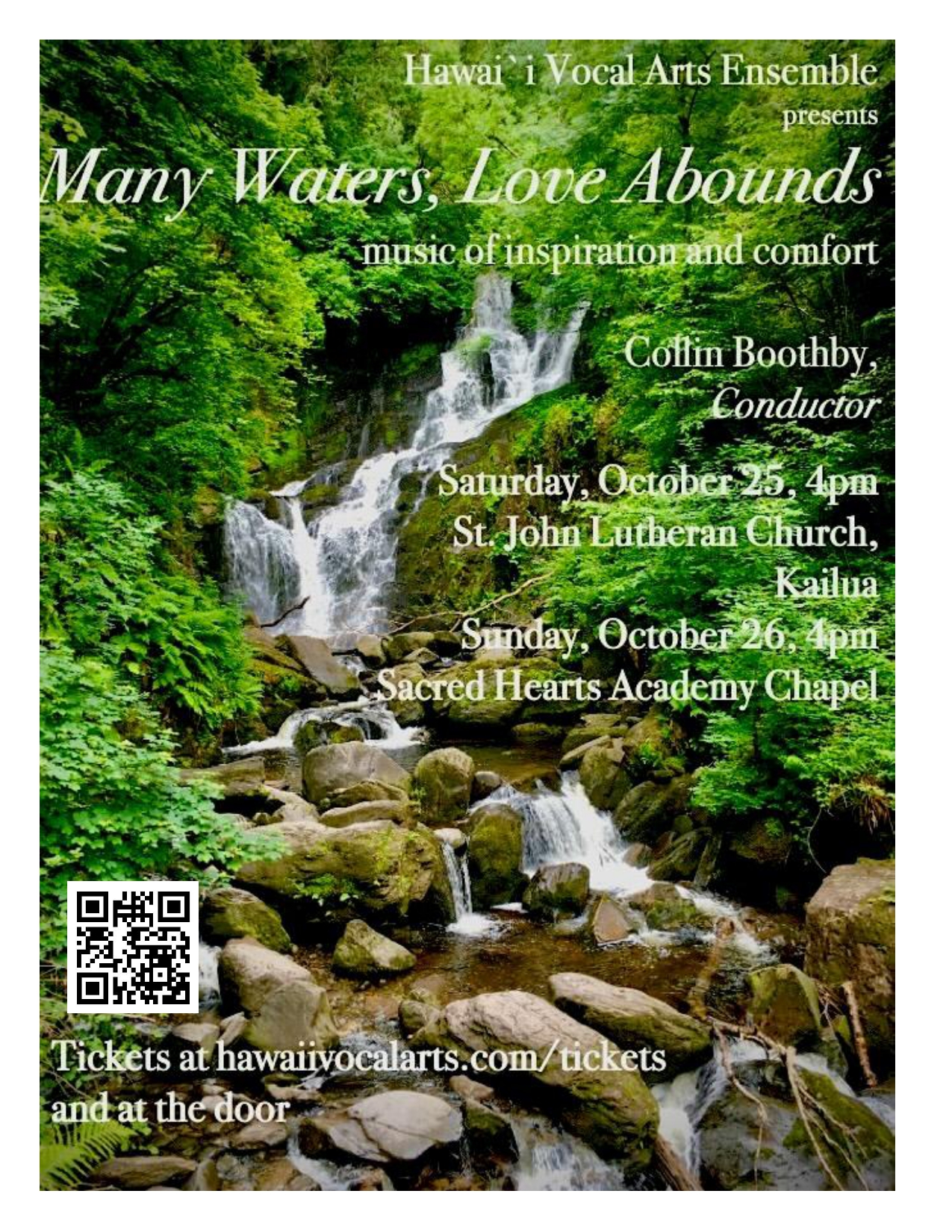The Hawaiʻi Vocal Arts Ensemble presents “Many Waters, Love Abounds” in two performances! Join HVAE for an afternoon of musical inspiration and comfort on Saturday, October 25th at 4:00PM at St. John Lutheran Church in Kailua OR on Sunday, October 26th at 4:00PM at Sacred Hearts Academy Chapel.