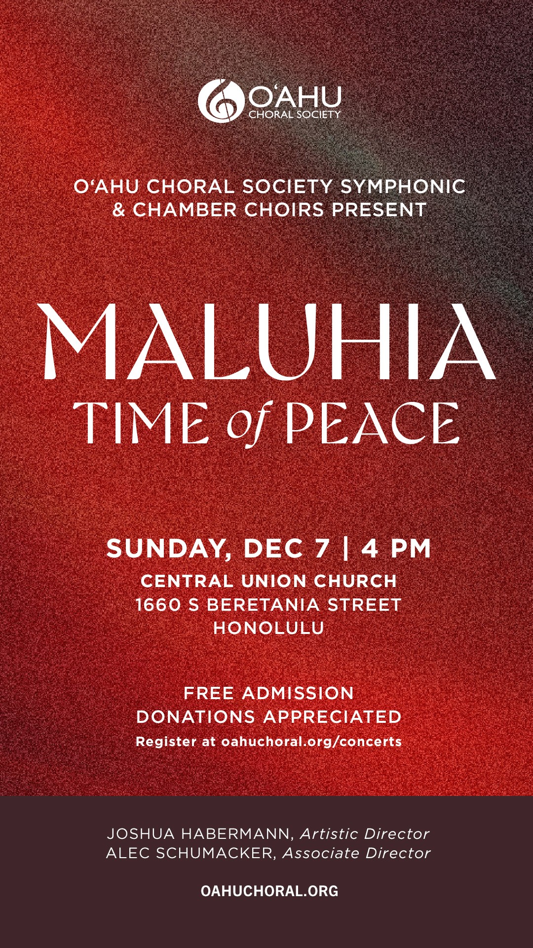 The holiday season is here! Join us for our annual Maluhia concert to celebrate with festive choral music and joyful audience carols