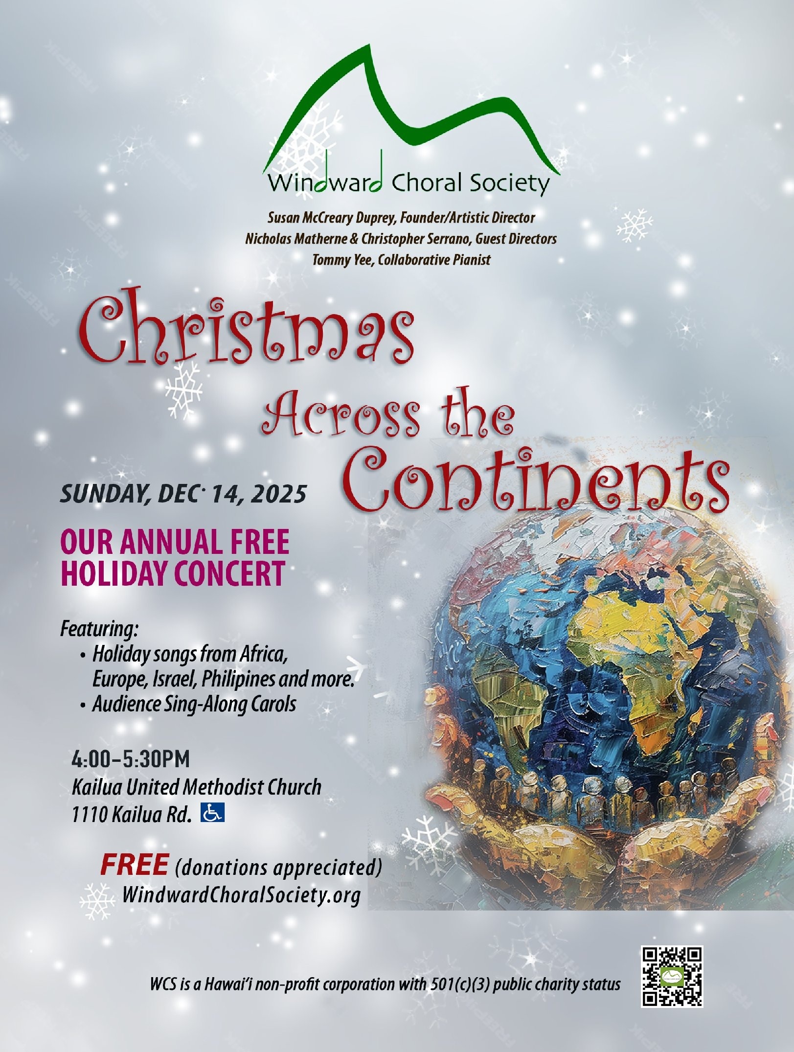 The 100-voice Windward Choral Society, led by directors Nicholas Matherne and Christopher Serrano with collaborative pianist Tommy Yee, joyfully invites the community to “Christmas Across the Continents,” a free holiday celebration filled with seasonal cheer and music from around the world!