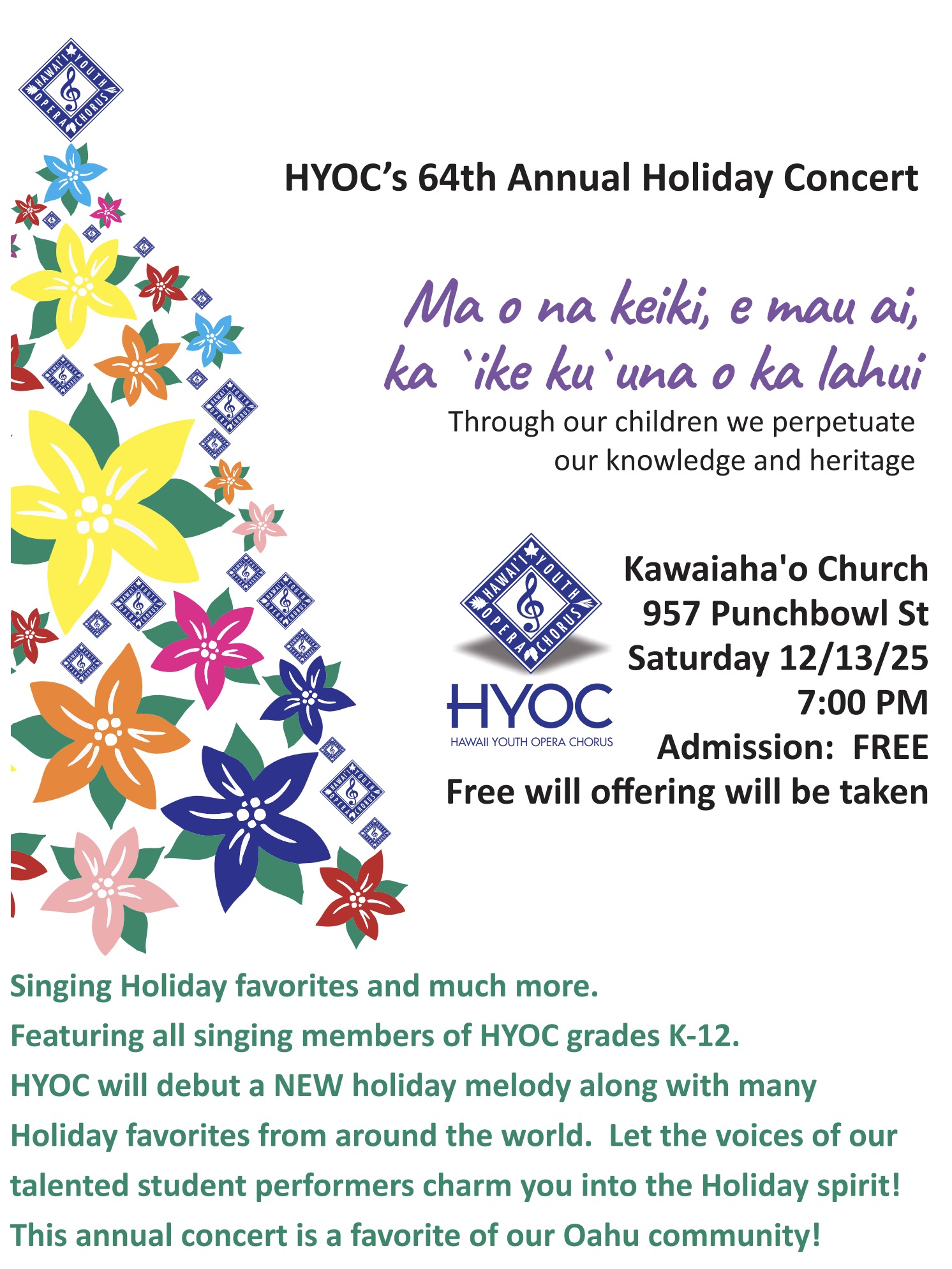 Join HYOC for their 64th annual Holiday Concert on Saturday, Dec. 13th at 7:00PM at Kawaiaha’o Church in Honolulu! This free concert by HYOC will debut a new Holiday mele composed and gifted by Kaipo Hale along with many other island holiday mele and favorites for the season from around the world. Street parking or municipal parking is available.