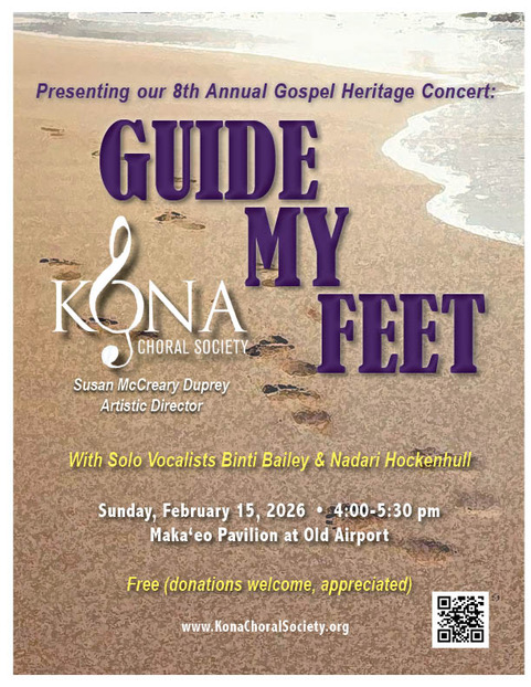 The Kona Choral Society proudly presents its eighth annual Gospel Heritage Concert, featuring the powerful sound of its 100+ voice ensemble under the direction of Susan McCreary Duprey, Conductor and Artistic Director, with Gloria Juan, accompanist, and Sharon Cannon, percussionist. This uplifting afternoon of gospel music will also showcase special guest artists Binti Bailey and Nadari Hockenhull, vocal soloists, along with Jason Stith on bass guitar and Daniel Heathcock on keyboard.