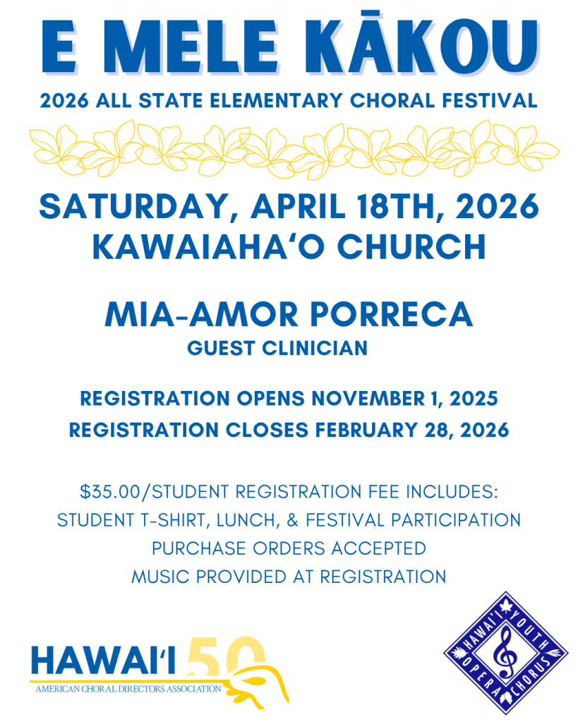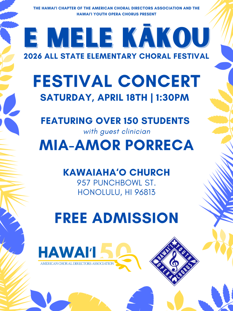 The Hawaiʻi Chapter of the American Choral Directors Association, in partnership with the Hawaiʻi Youth Opera Chorus, presents the 2026 E Mele Kākou: All-State Elementary Choral Festival on Saturday, April 18, 2026, at Kawaiahaʻo Church. This year’s festival will feature guest clinician Mia-Amor Porreca, who will lead participating students through a day of collaborative music-making and learning.