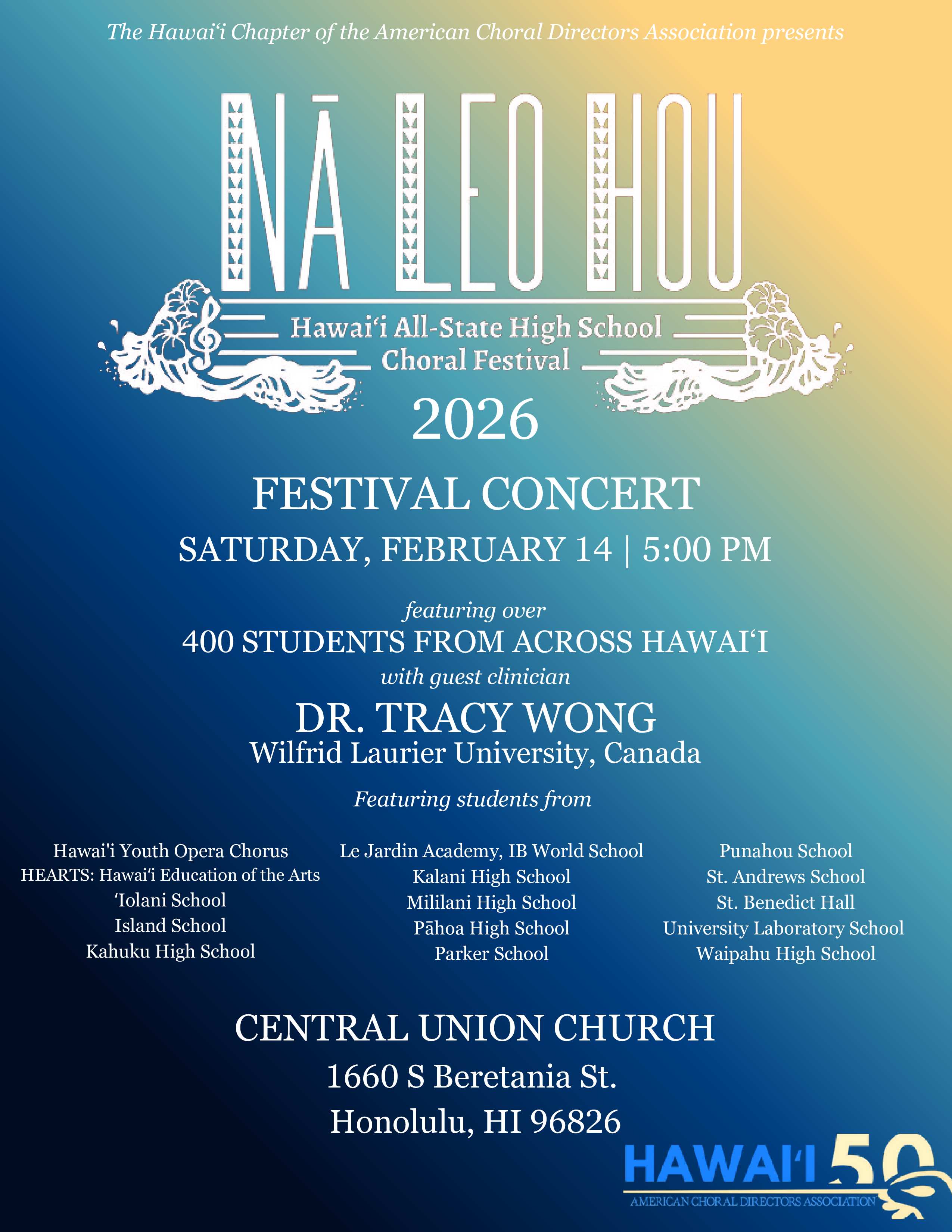 The mission of Nā Leo Hou, the High School Choral Festival, is to provide local high school singers with a high-quality choral experience with a renowned clinician, create a venue for individual school choir and mass ensemble performances, and foster collaboration, socialization, and cooperation between singers. Over the course of the festival, participants engage in rehearsals and communal activities. The festival concludes with a free public concert, providing a memorable choral experience for all involved.